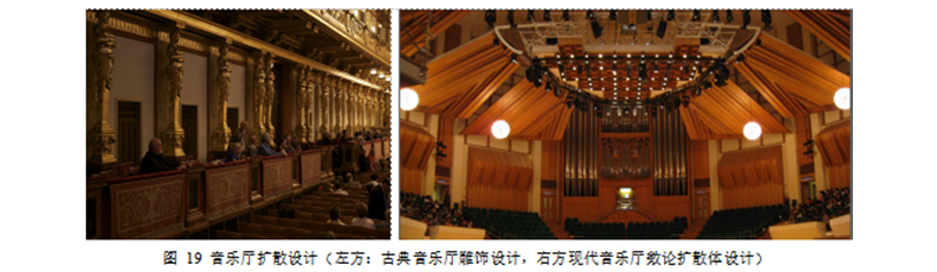 墻面形狀、尺寸、布置的合理設計以及擴散體的設計與布置來滿足。設計合理的吊頂可以為觀眾廳提供豐富而均勻的早期反射聲,舞臺臺口至面光橋之間的大天花,能夠為前中區提供早期反射聲,面光橋后部的天花吊頂能夠為池座中后部及樓座觀眾席提供早期反射聲。而合理設計側墻的造型,能夠使觀眾廳的側向反射聲更豐富,聲場更為擴散,這也有利于加強觀眾席的空間感。而側墻上擴散反射體的設計能夠為觀眾廳提供大量的側向反射聲,這都能改善觀眾廳的空間感并使觀眾廳具有良好的聲場分布均勻度。