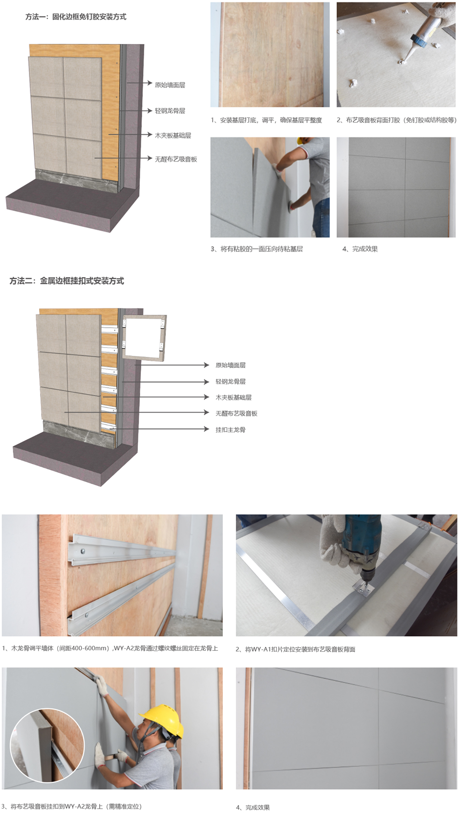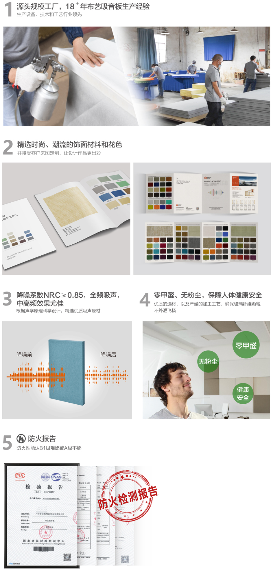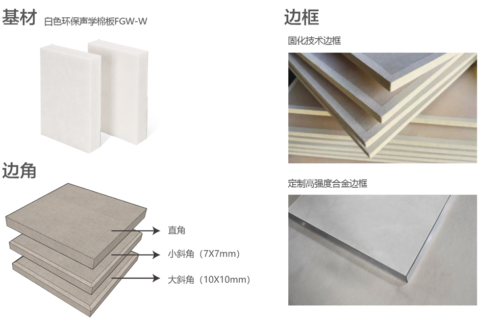 外包可選擇阻燃聲學布、A級防火玻纖布等,多品類、多顏色及多圖案,也接受客戶提供飾面材料;可定制固化技術邊框和高強度合金邊框結構,防火、環保、防潮及抗變形性能更優。