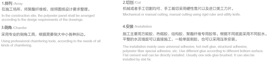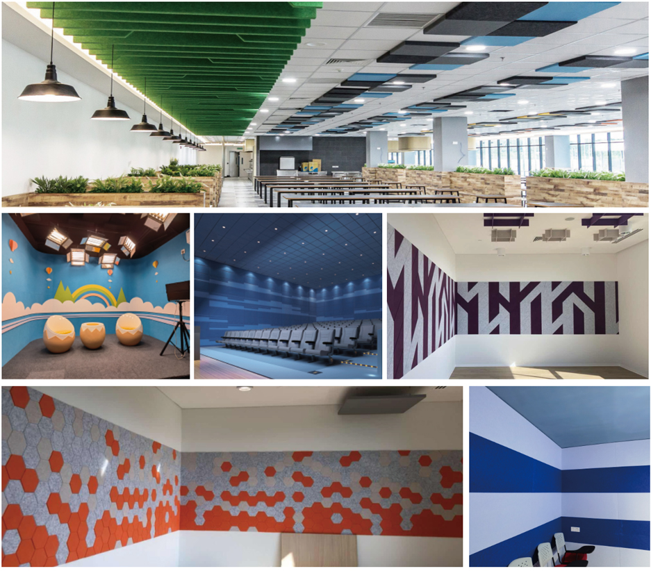 聚酯纖維吸聲板是由100%聚酯纖維為原材料,經過熱壓合成繭棉狀。孔隙率達到90%以上,在中高頻率具有良好的吸聲效果。聚酯纖維吸聲板具有高密度、環保、阻燃、施工簡單、容易切割、無粉塵等性能,飾面顏色多樣,很好滿足客戶多樣化的需求以及裝飾效果。