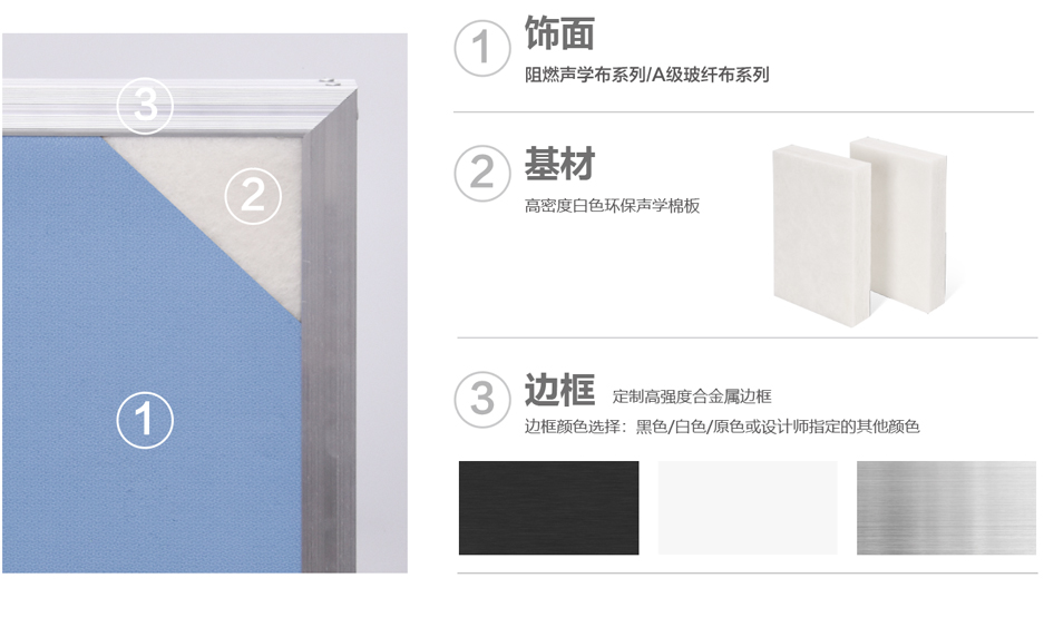 • 結(jié)構(gòu)度定制高強(qiáng)合金邊框,內(nèi)置白色環(huán)保聲學(xué)棉,棉的表面復(fù)合環(huán)保密閉吸聲氈,表層包裹A級防火玻纖布或阻燃聲學(xué)布