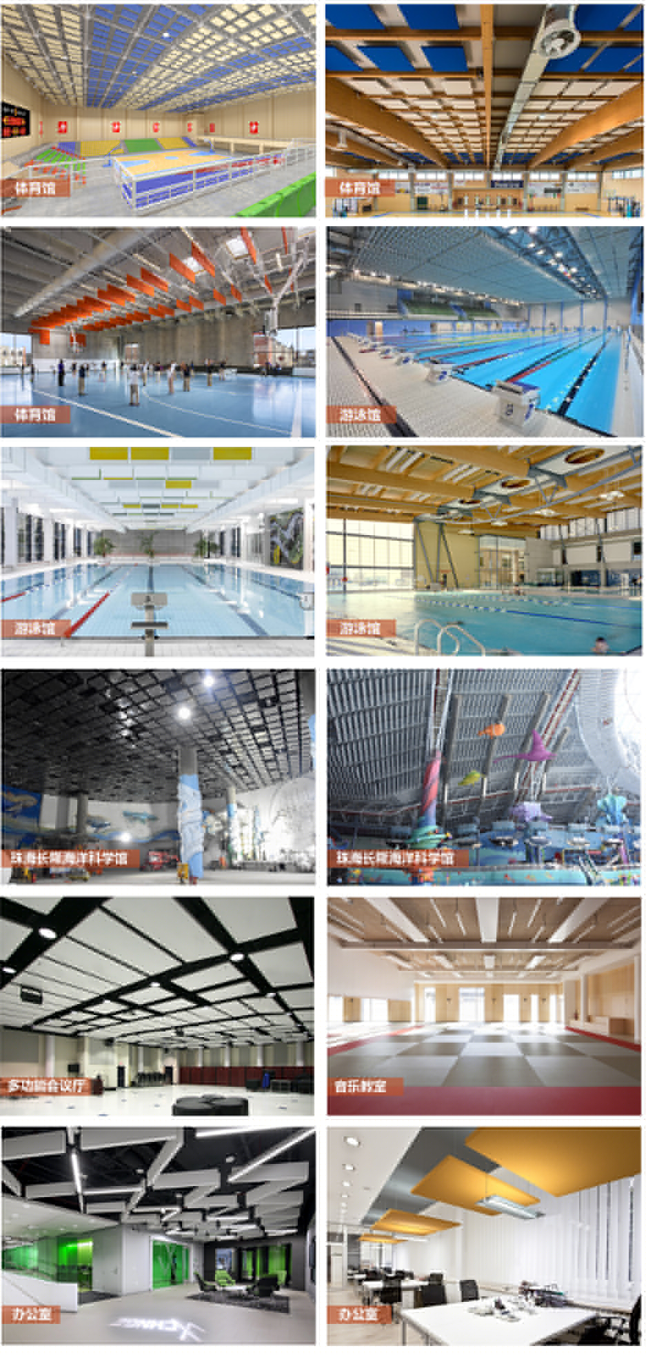 各類體育場館(游泳館等)、會展中心、演藝廳、多功能會議廳、辦公室、教室課室、酒吧餐吧等需要強(qiáng)吸聲高環(huán)保的場所。