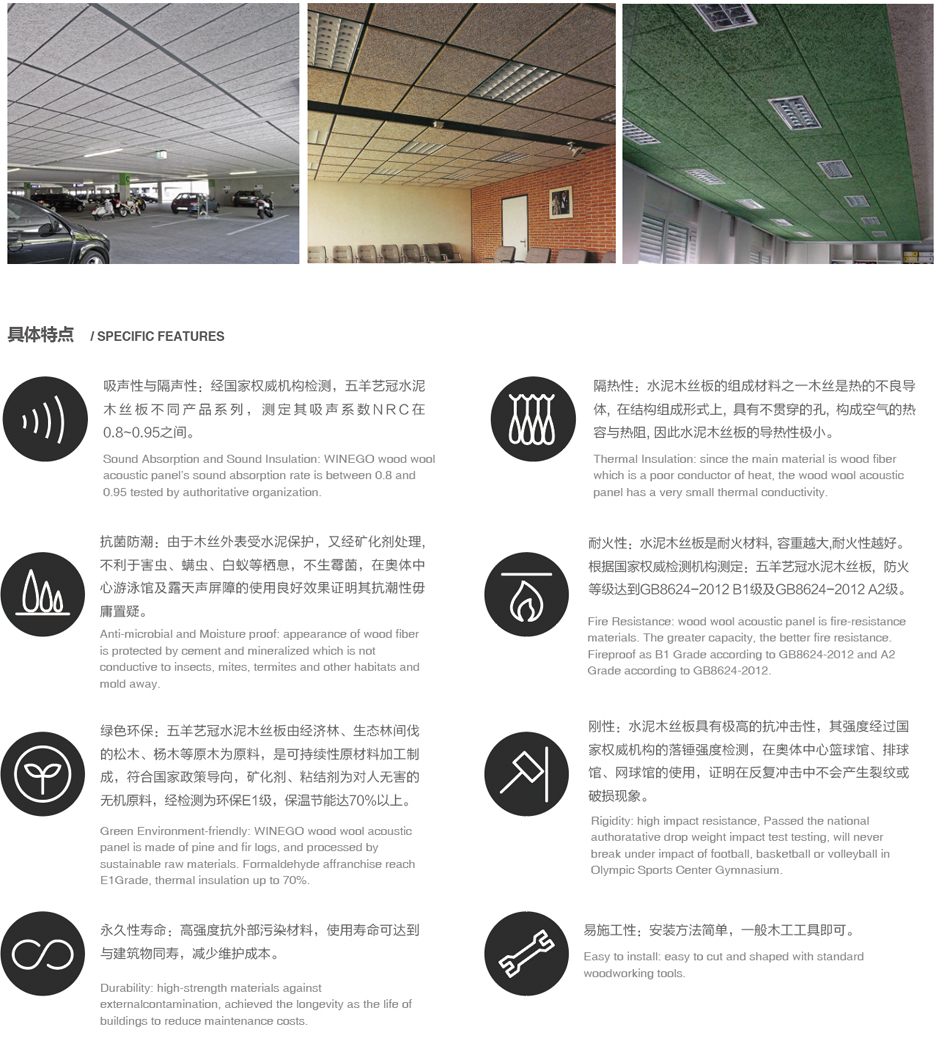 木絲吸音板的表面紋理表現出高雅質感與獨特品味,可充分演繹設計師創意和理念。該產品結合木材與水泥的優點:如木材般質輕,如水泥般堅固,具有吸音、抗沖擊、防火、防潮、防霉等多種功能。